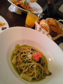 私はベーコンとジャガイモとキノコのジェノバ風パスタ。