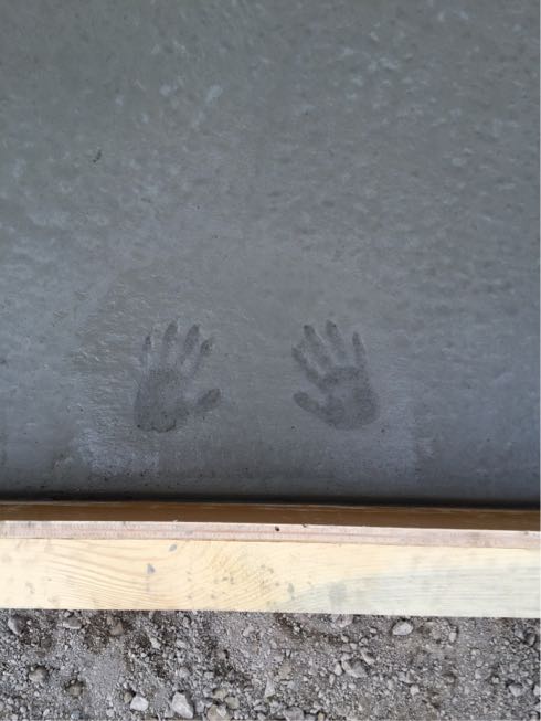 あらかじめ職人さんにお願いしてあったので、キレイにコテで平らにした犬走りに、息子の手形をペッタンコさせてもらいました(笑)